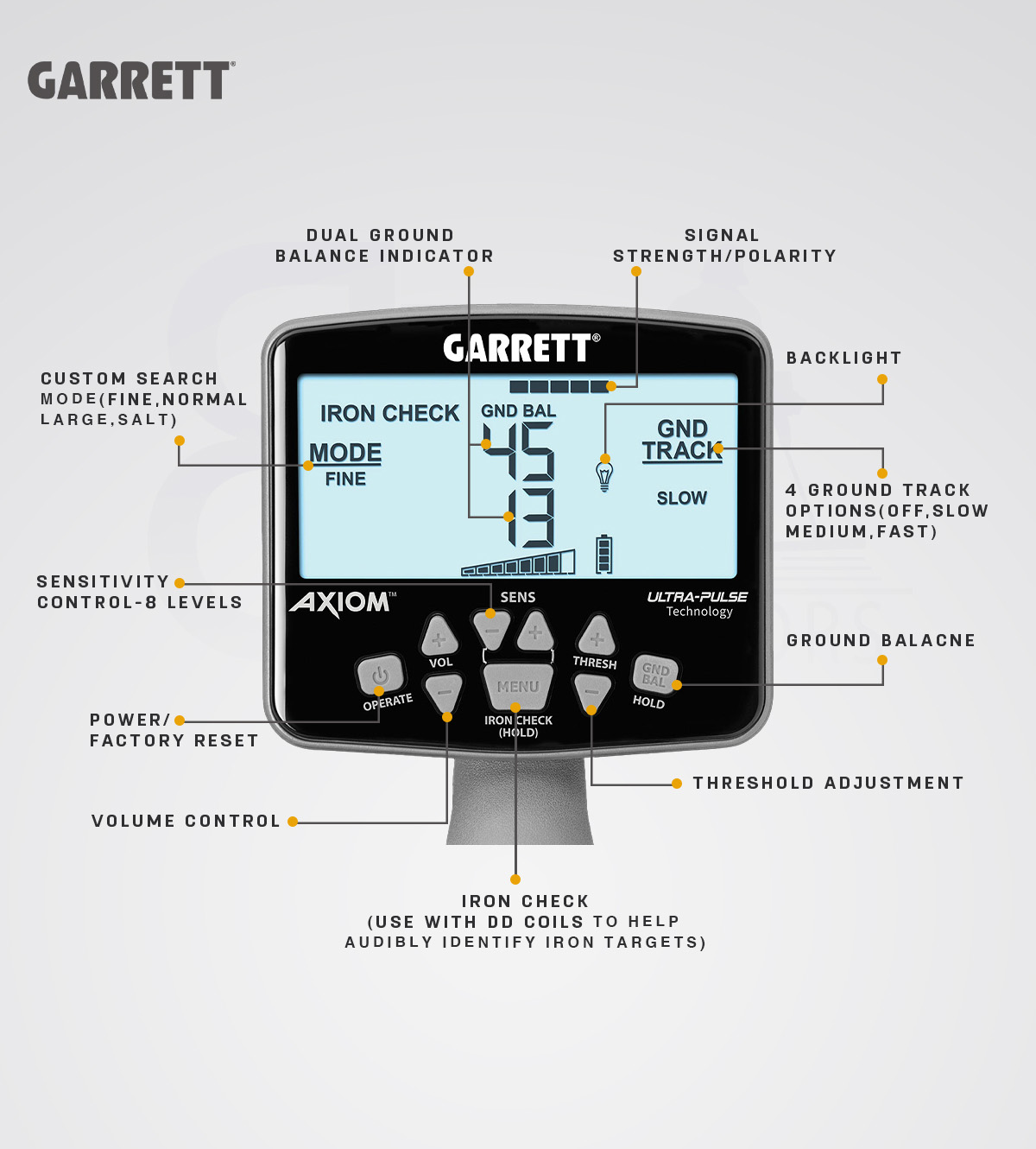 • TerraScan: The advanced Axiom system provides an independent, dual-channel ground balance that covers the full range of mineralization, from highly mineralized magnetic ground to soft water, and everything in between