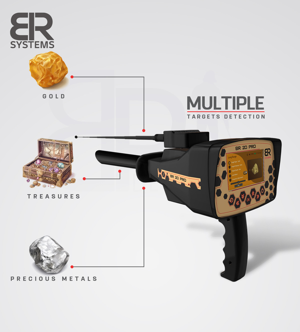 • BR 20 Pro is a Long Range Locator device that specializes in detecting gold, treasures and precious metals underground from long distances.