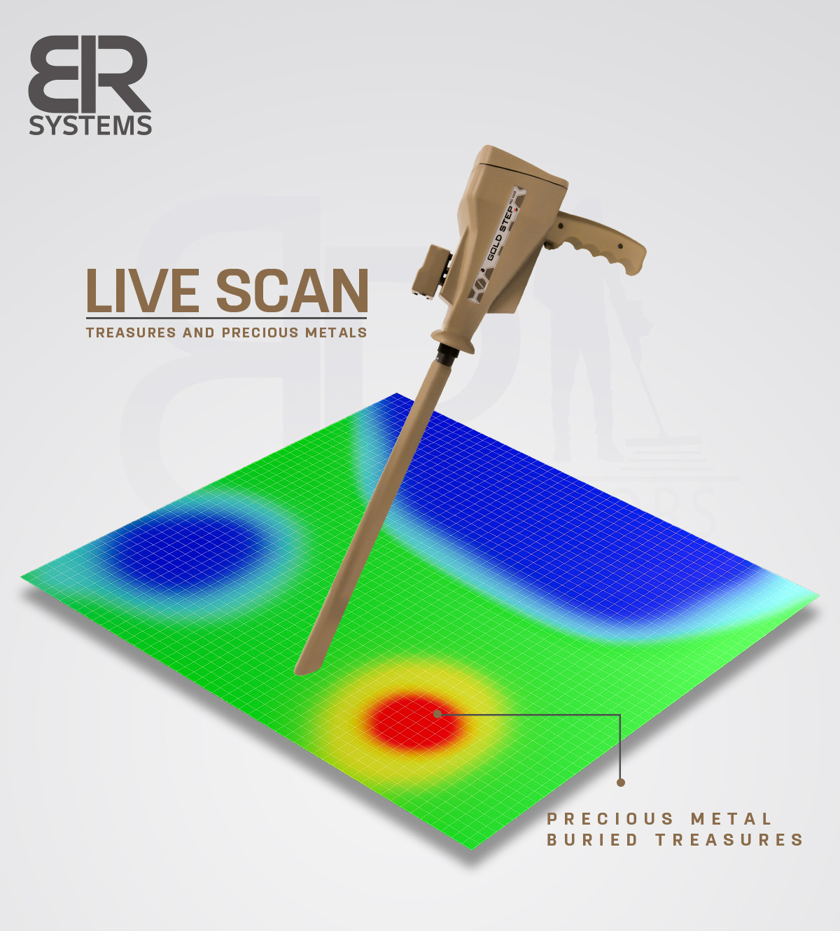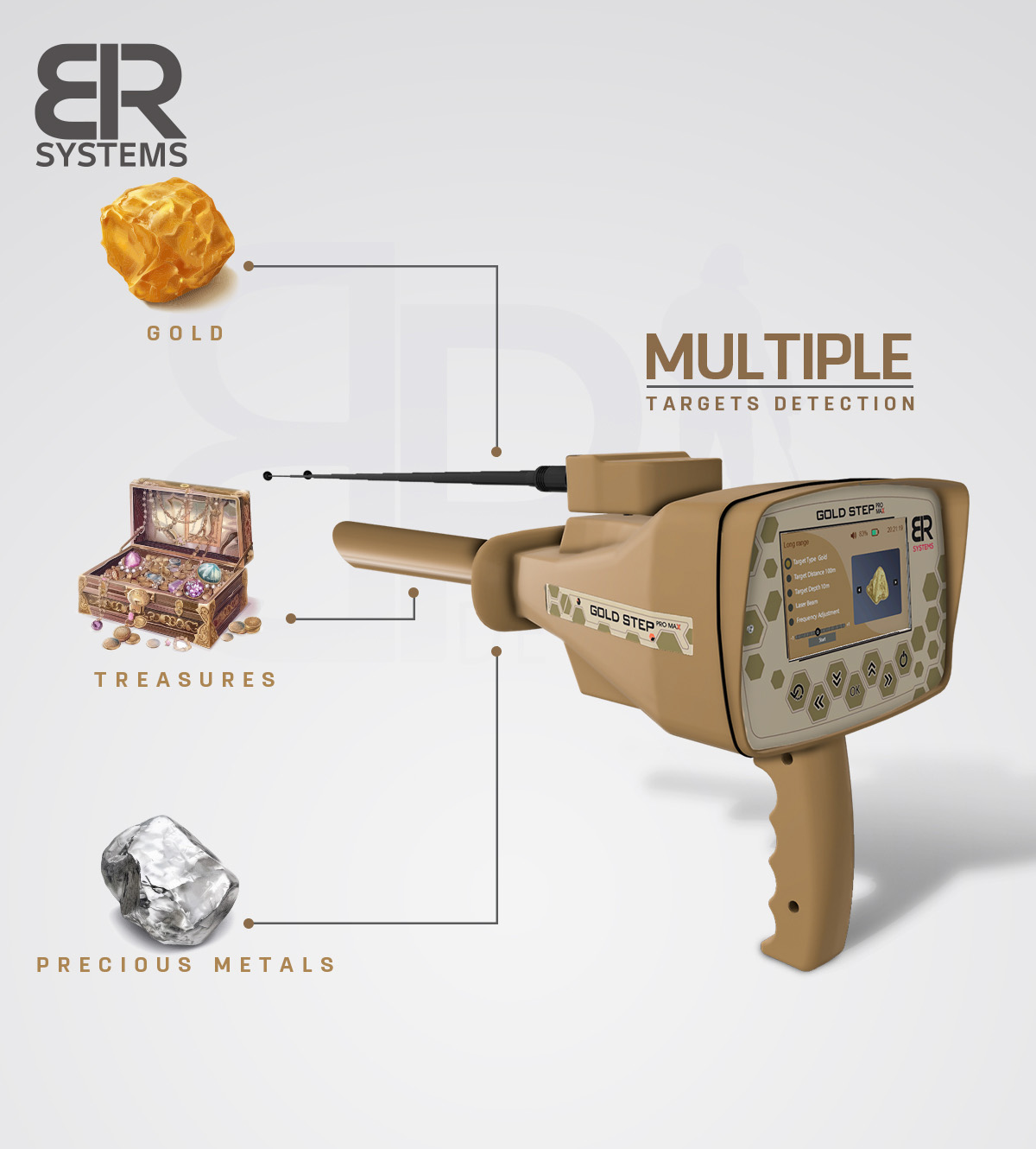 • The Gold Step Pro Max device works with 5 modern scientific systems specialized in detecting gold, treasures and precious metals underground. These systems have been updated and developed over many years so that we now have an accurate and integrated scientific device that can deliver you to your targets in a short time.